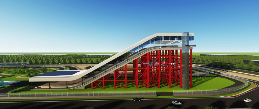 比亞迪紹興嵊州賽車場以極速競技與自然景觀的融合為設計核心,干拔沙坡觀景平臺作為賽道的標志性節點,同時滿足了功能性、標志性與生態協調性。設計靈感來源于賽車疾馳時揚起的沙浪與風動軌跡,通過鋼結構的剛性骨架與膜材的柔性質感,塑造出如沙丘起伏般的動態形態,既呼應賽車場的速度美學,又為觀眾提供遮陽避雨的舒適空間。該項目PTFE膜屋面展開超3萬平方米。