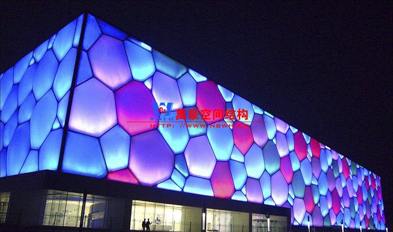 “水立方”就是一個非常典型的充氣式膜結構建筑,它的外表由許多不同大小、形狀、矢高的ETFE氣枕組成,外層所使用的淺藍膜和內層的鍍點膜在陽光照射下讓ETFE氣枕出現兩個高光,更加體現出了水泡的特征。這種獨特的對光線控制的技術,使得“水立方”成為了世界上獨特的建筑形式,展現出了前所未有的整體建筑的藝術效果。同時氣枕盡管大小不同,其矢高調剖控制在12-15%的跨度之內,這樣就是的整體效果此起彼伏,立體感更加的明顯,建筑的表現力更加的豐富。