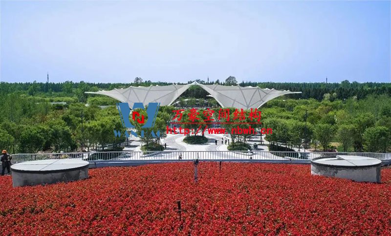 花博園北園的主入口構筑物,是全新“仿生鋼結構骨架外掛柔性幕墻”膜結構,既形似兩棵枝繁葉茂的大樹、又勝似兩朵盎然怒放的白玉蘭。仿生鋼結構體系大門高19.21米,寬100米,寓意中國共產黨建黨一百周年。