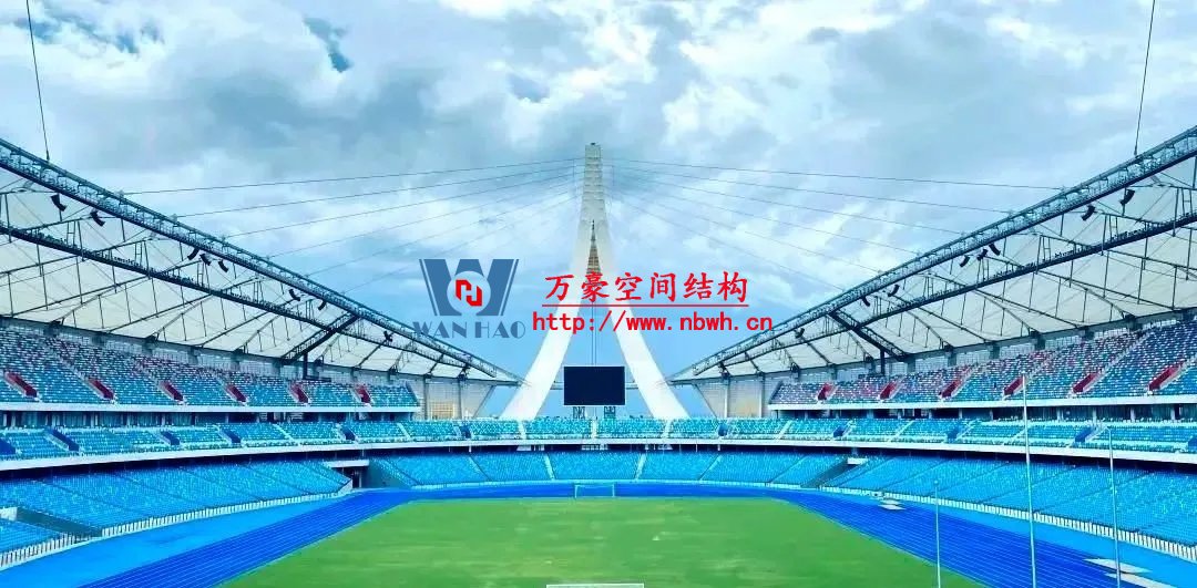 “‘豎琴’與‘天傘’的交相輝映”是對斜拉索桁柔性罩棚受力體系的形象描述。兩座高達99米“人”字形索塔一端拉起18根斜拉索,另一端連接8根背索,猶如兩把空中“豎琴”將索桁架罩棚輕輕吊起,在大跨度張拉中演奏一曲建筑贊歌。