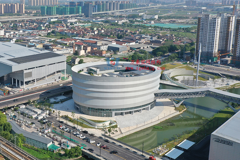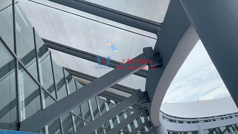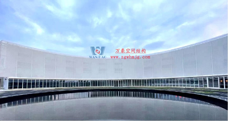由萬豪承建的紹興國際會展館中心外立面網(wǎng)格織物膜,由5凸5凹不同標(biāo)高的柔線組合成飄絲帶,視覺效果極具沖擊力。