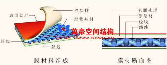 用于膜結(jié)構(gòu)建筑中的膜材是一種具有強(qiáng)度,柔韌性好的薄膜材料,是由纖維編織成織物基材,在其基材兩面以樹(shù)脂為涂層材所加工固定而成的材料,中心的織物基材分為聚酯纖維及玻璃纖維,而作為涂層材使用的樹(shù)脂有聚氯乙烯樹(shù)脂(PVC)及聚四氟乙烯樹(shù)脂(PTFE),在力學(xué)上織物基材及涂層材分別具有以下功能性質(zhì)。