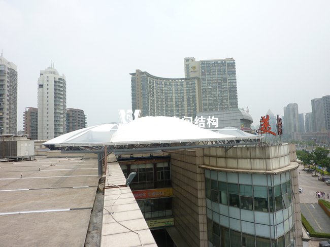 穹頂采用ETFE透明膜作為點綴,既解決了采光問題又增添了觀賞性,穹頂中心用直徑12鋼索解決了結構的穩定性,大大提高了地面空間的利用率。克服了舊建筑物大跨度無立柱施工的難題,讓購物的市民享有整潔的休憩空間,成為了蕭山城市的輪廓線。