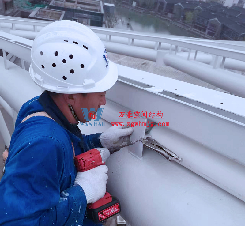文一塘溪津門天幕鋼結構及ETFE氣枕膜工程由寧波萬豪空間結構工程有限公司承建,該項目用鋼量900噸,膜結構展開面積7000平米。今年以來,萬豪施工團隊緊抓時間節點,工程進度推進迅速。