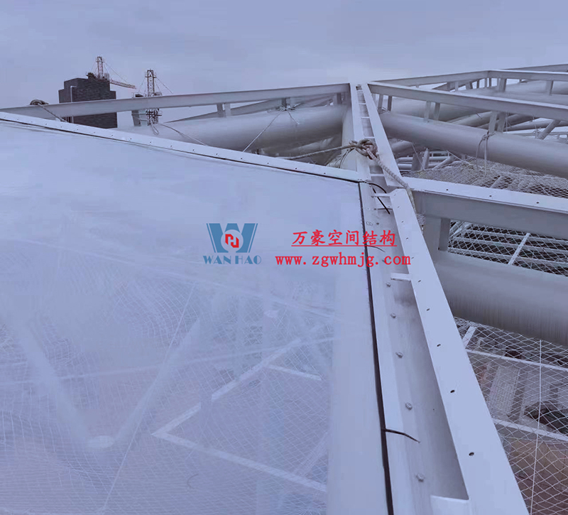 最近項目不斷傳回最新施工進展,目前鋼構主體已經完成,油漆的涂刷、二次鋼構以及排水管道的安裝也已接近尾聲,現在進行最后的收尾工作。樣品膜的試裝也已完結,等待后期整體鋼構以及排水管安裝完畢,開始進行膜體的安裝。期待工程的整體完工,讓我們能夠盡早一飽眼福。