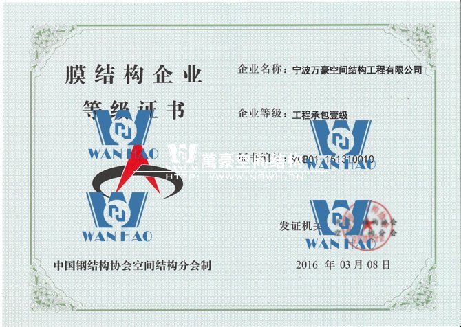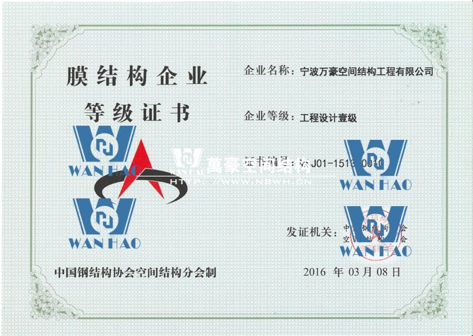 憑借著公司的硬實(shí)力,寧波萬(wàn)豪空間結(jié)構(gòu)工程有限公司在膜結(jié)構(gòu)企業(yè)等級(jí)會(huì)員第十六次評(píng)審中榮獲工程承包、專項(xiàng)設(shè)計(jì)雙一級(jí)資質(zhì)。標(biāo)志著公司向前更進(jìn)一步,也是協(xié)會(huì)對(duì)公司實(shí)力的認(rèn)可,公司將不斷努力,為膜結(jié)構(gòu)行業(yè)的發(fā)展貢獻(xiàn)自己的力量。