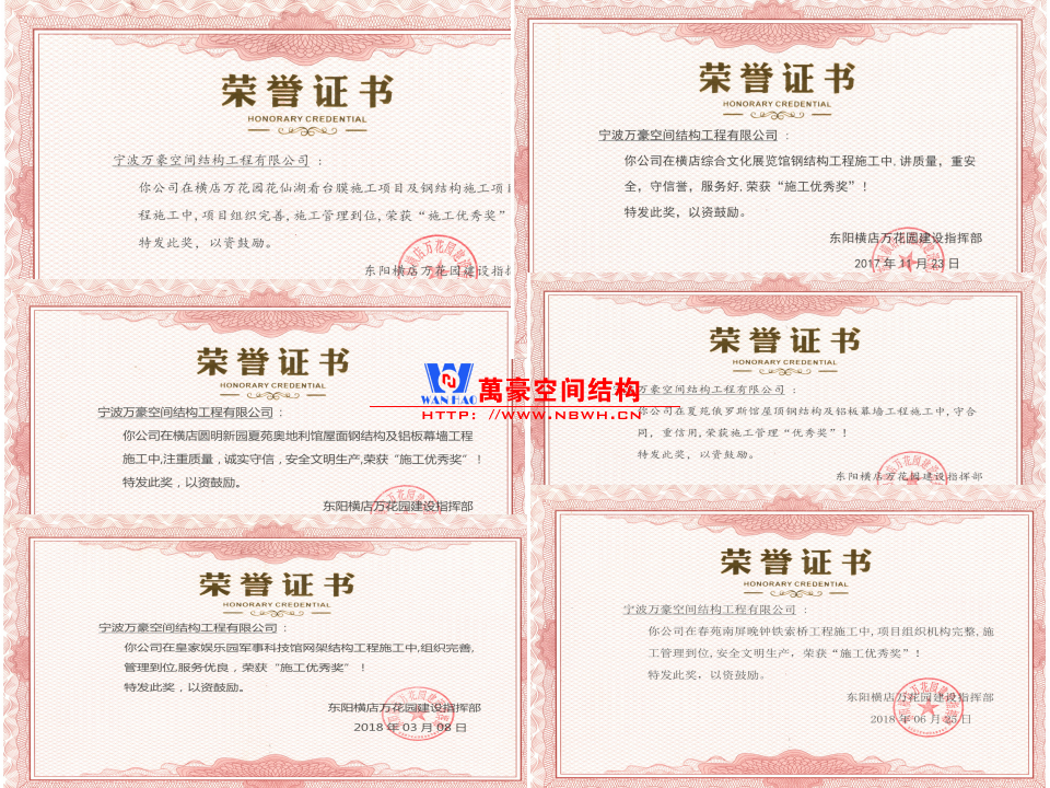無論是膜結構工程,還是其他行業的工程,作為施工方,最大的褒獎莫過于業主的肯定。作為肯定的見證,為你頒發的榮譽證書是最好的證明。 大家還記得萬豪在橫店做的一系列膜結構工程嗎?所有的工程,全部獲得了業主的高度評價,全都獲得了榮譽證書。這就是實力的證明,這就是技術的展現。